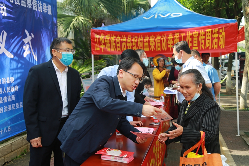 5月18日一大早,在江华瑶族自治县信访局大院门口,县纪委监委刚刚摆开接访“摊位”,就有不少群众围了上来。县委常委、县纪委书记、县监委主任唐亚辉现场接访,向过往群众宣传纪检监察机关信访举报相关政策法规,解答信访举报受理范围、受理渠道等群众普遍关心的问题,并现场受理群众反映的问题。这是该县开展纪检监察信访举报宣传周活动的一个缩影。