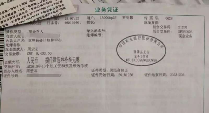 我问到驻在单位在县财政局会计管理中心的账号,存了进去,在交易附言注明:退2018年13个月工资和预发绩效考核奖。
