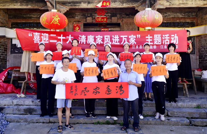 “各位老师把女书文化重新带回到我们村里来,让村里小孩子多学习少玩手机,让大人多写字少打牌,让我们的民风更淳朴。”上江圩镇龙田村村民何员聪在廉洁文化进乡村活动现场说道。8月6日-13日,江永县纪委监委组织30多名女书文化志愿者和女书文化传承者来到上江圩镇、兰溪瑶族乡、夏层铺镇等乡镇的7个村庄开展“喜迎二十大 廉洁家风进乡村活动”。