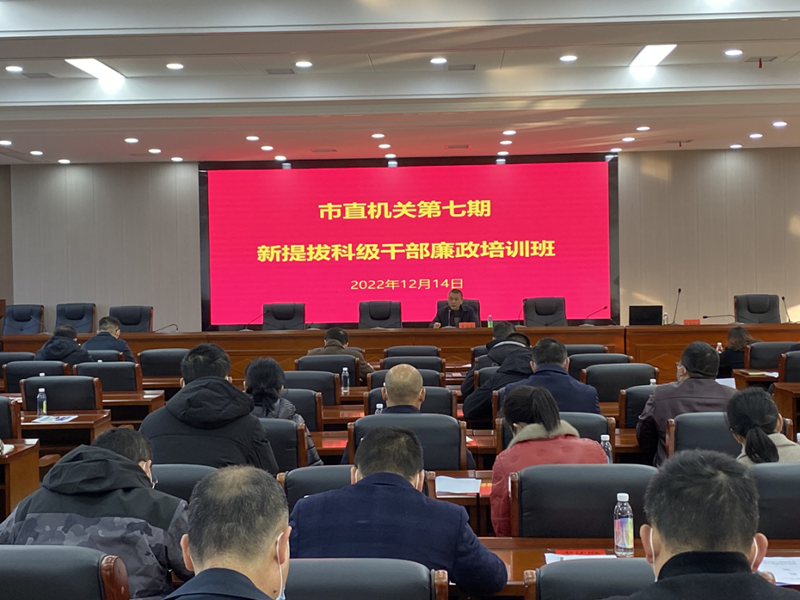 为贯彻落实全面从严治党要求,进一步增强市直机关新提拔科级干部纪律规矩和廉洁从政意识,12月14日,市直机关工委举办市直机关第七期新提拔科级干部廉政培训班,来自市直机关各单位的112名正科级干部参加培训。市直纪检监察工委书记肖品向作开班讲话。