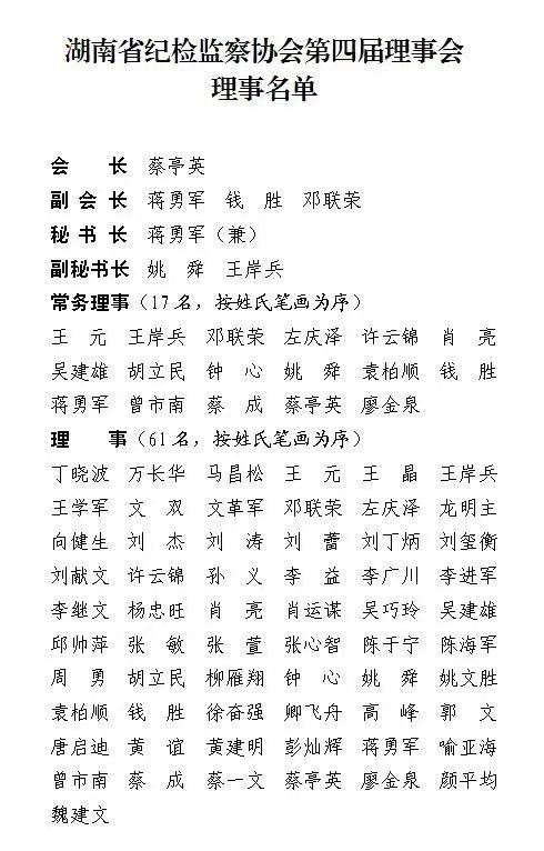 大会通过了协会章程和工作报告,选举产生新一届理事会。随后召开了湖南省纪检监察协会第四届理事会第一次会议,选举产生协会会长、副会长、秘书长、常务理事。省纪委副书记、省监委副主任蔡亭英当选湖南省纪检监察协会会长。(杨佳俊)